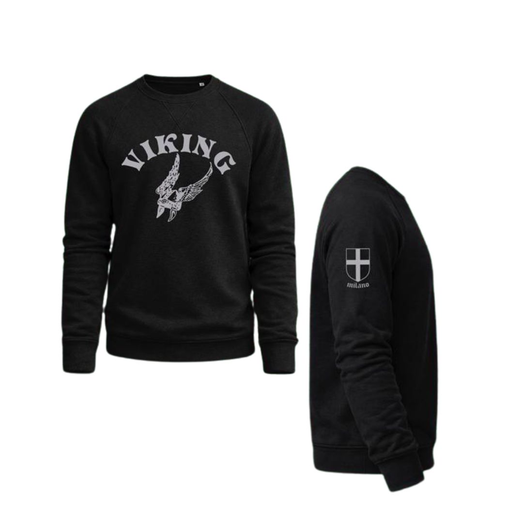 Felpa girocollo nera con stampa frontale Viking con logo elmo alato e stampa su braccio destro logo Milano.